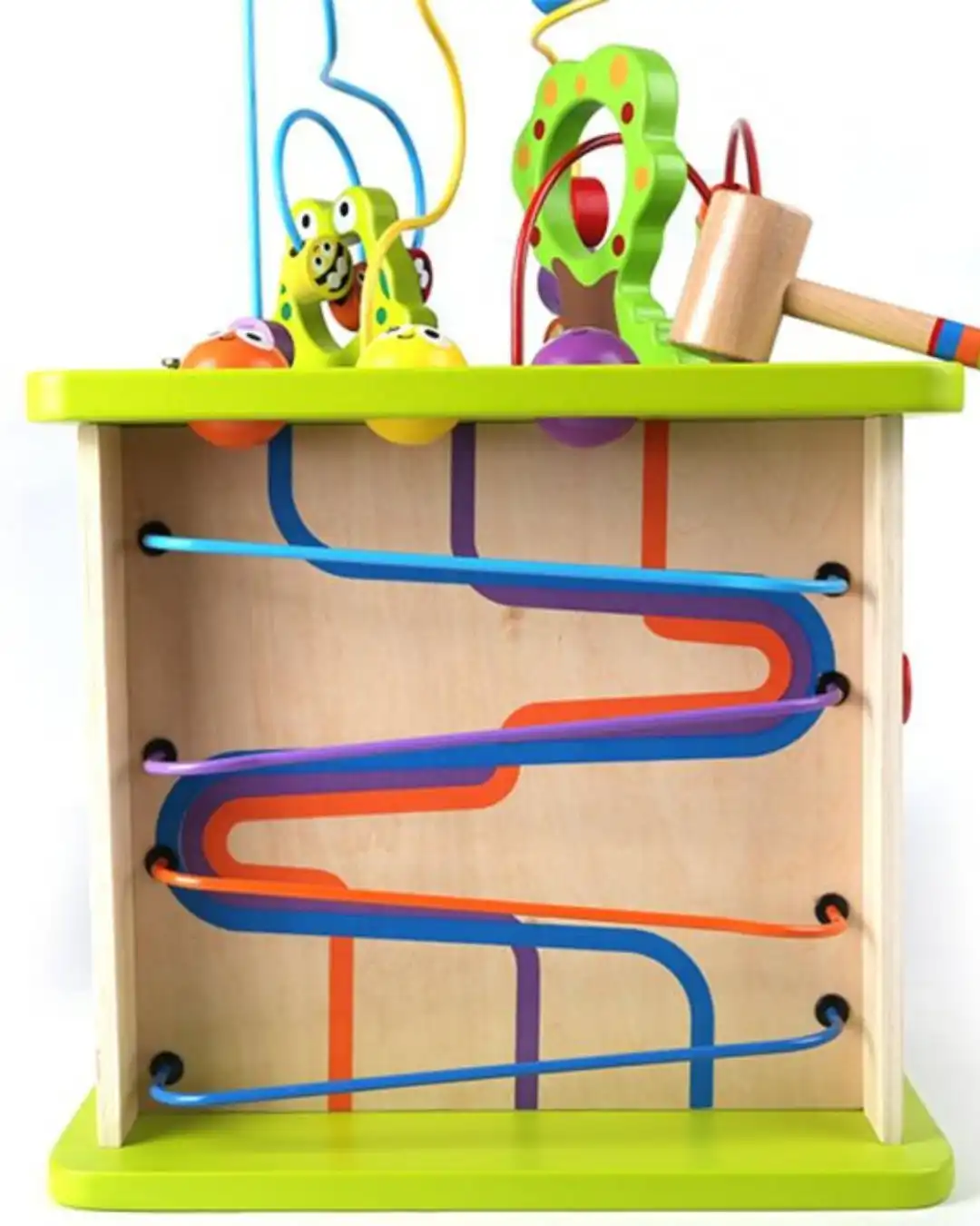 Gledajte kako vaše dete uživa u avanturi sa perlicama na vijugavim stazama, učestvuje u sortiranju oblika sa šest veselih figura, pomera životinje po određenim putanjama, okreće ploču sa zveckavim elementima i udara loptice koje jure niz stazu.