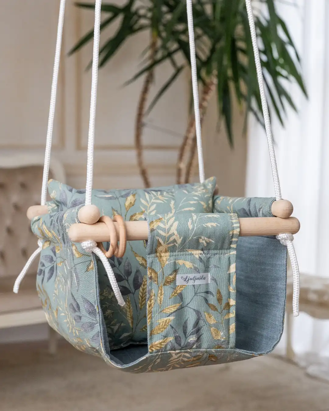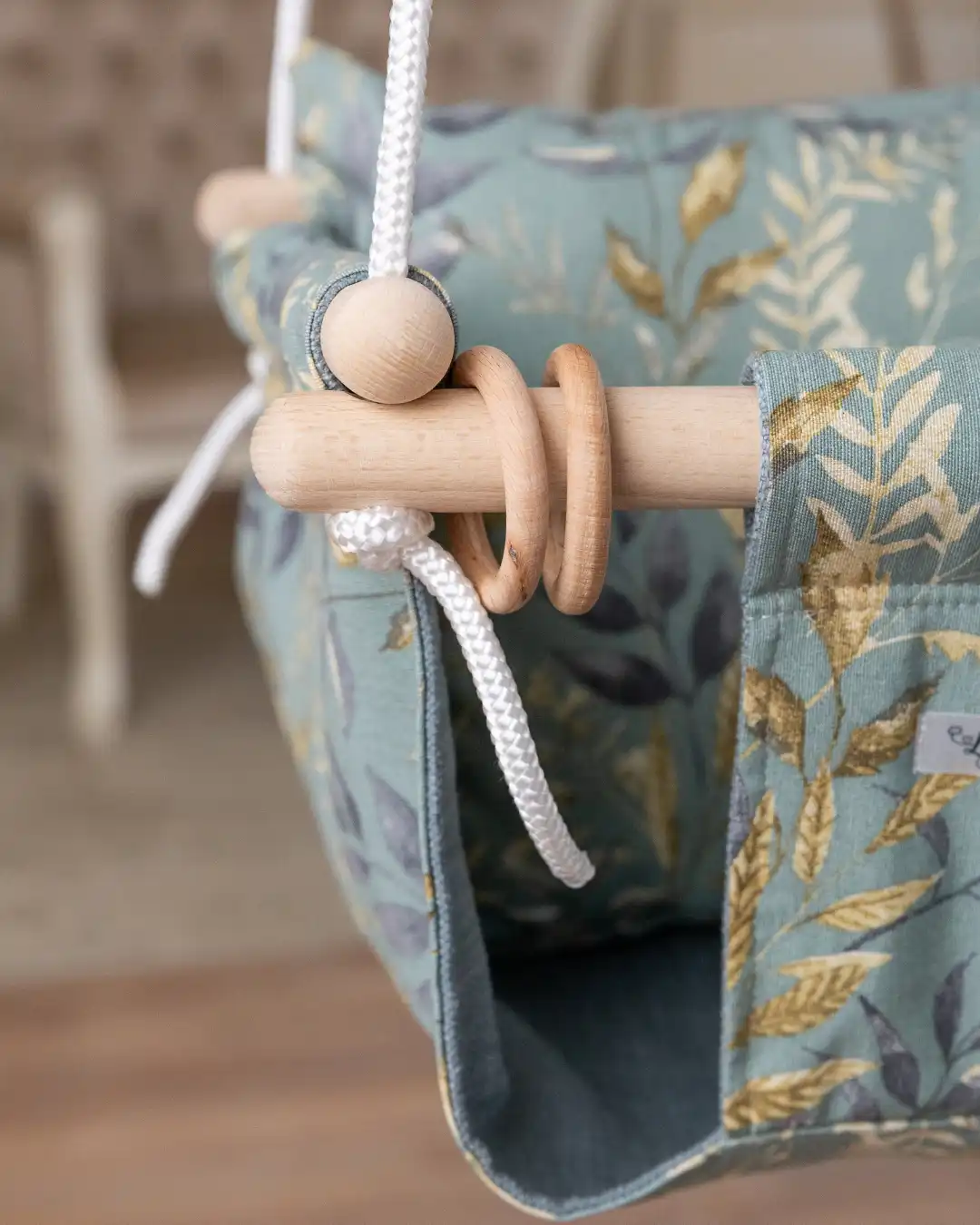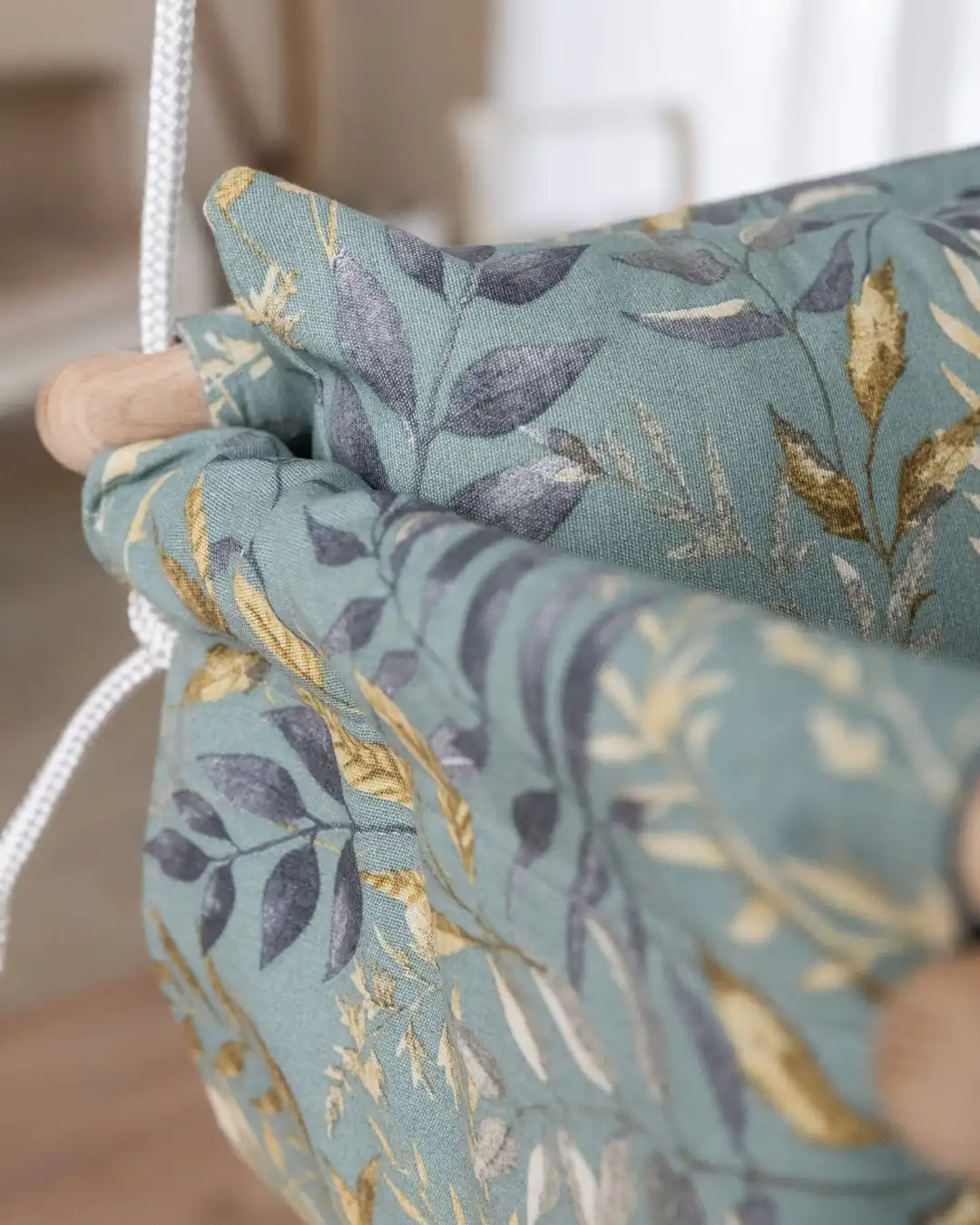 • Ljuljaška je sa dva lica – dekorativno šareno platno spolja i pamučno jednobojno maslinasto zelene  sa unutrašnje strane