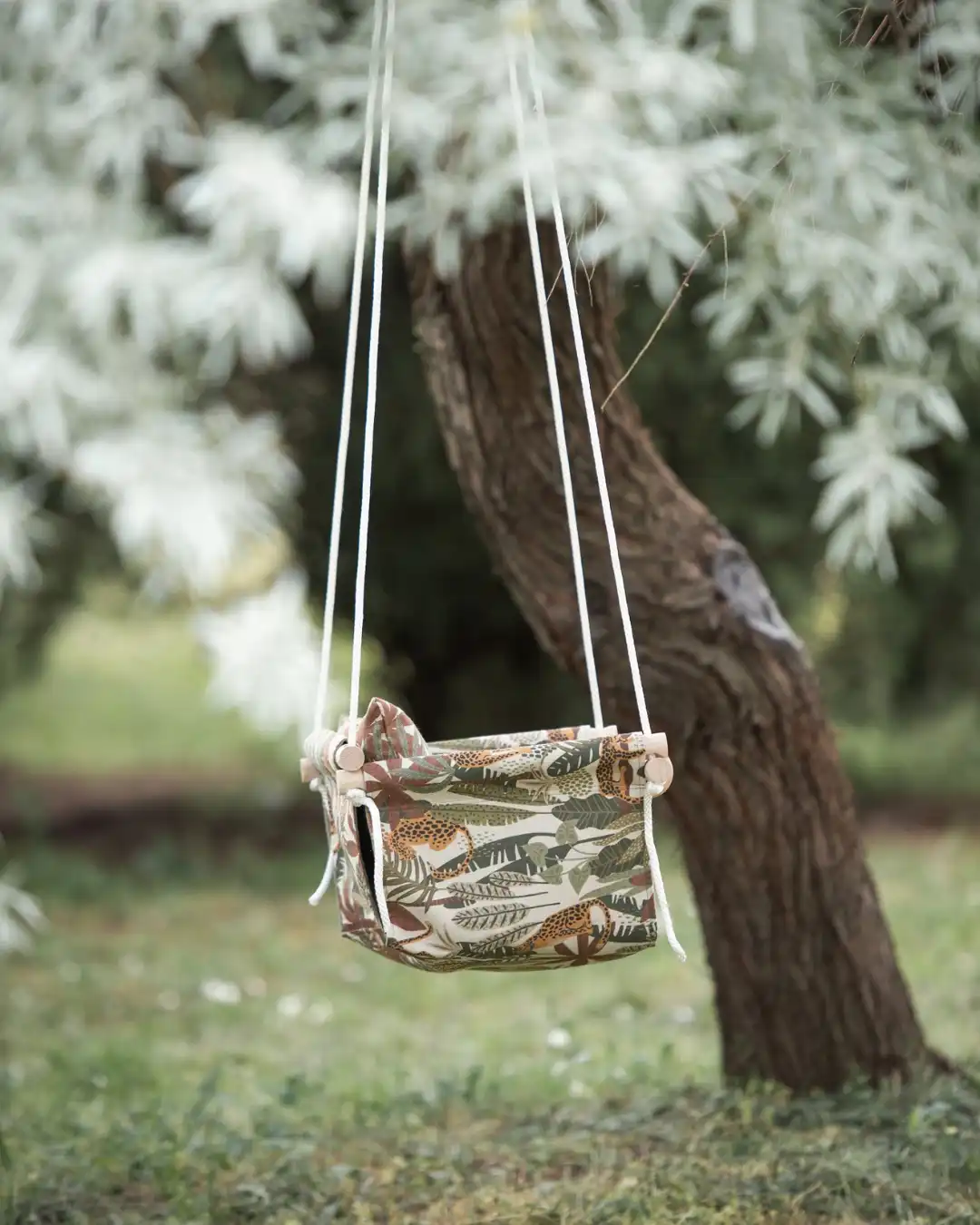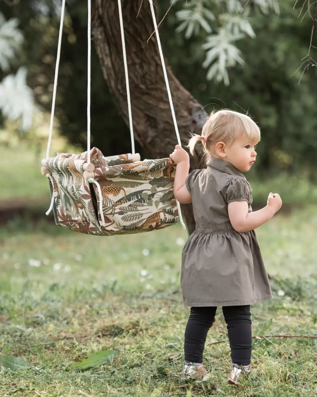 - Ljuljaška je sa dva lica – dekorativno šareno platno spolja i pamučno jednobojno maslinasto zelene sa unutrašnje strane