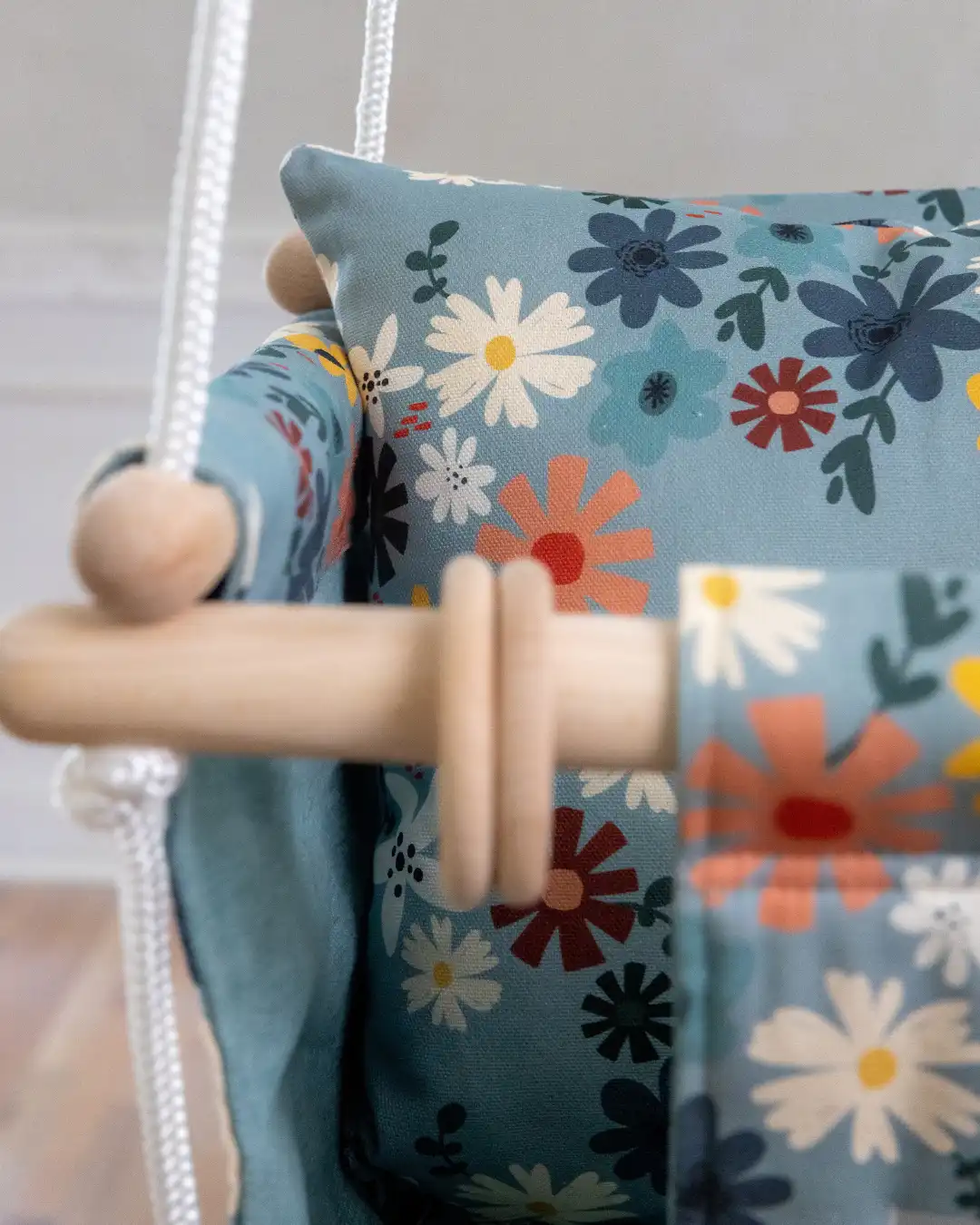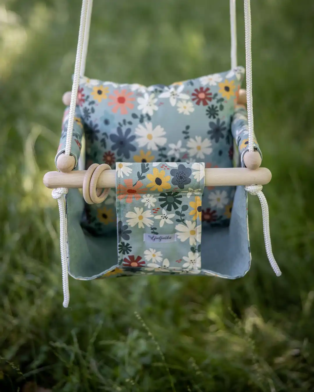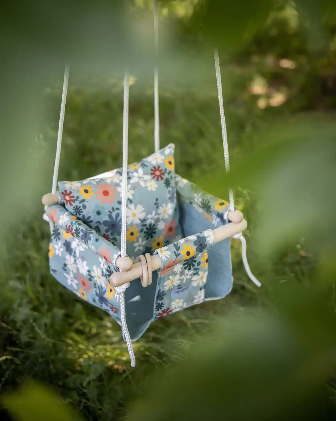 - Ljuljaška je sa dva lica – dekorativno šareno platno spolja i pamučno jednobojno maslinasto zelene sa unutrašnje strane