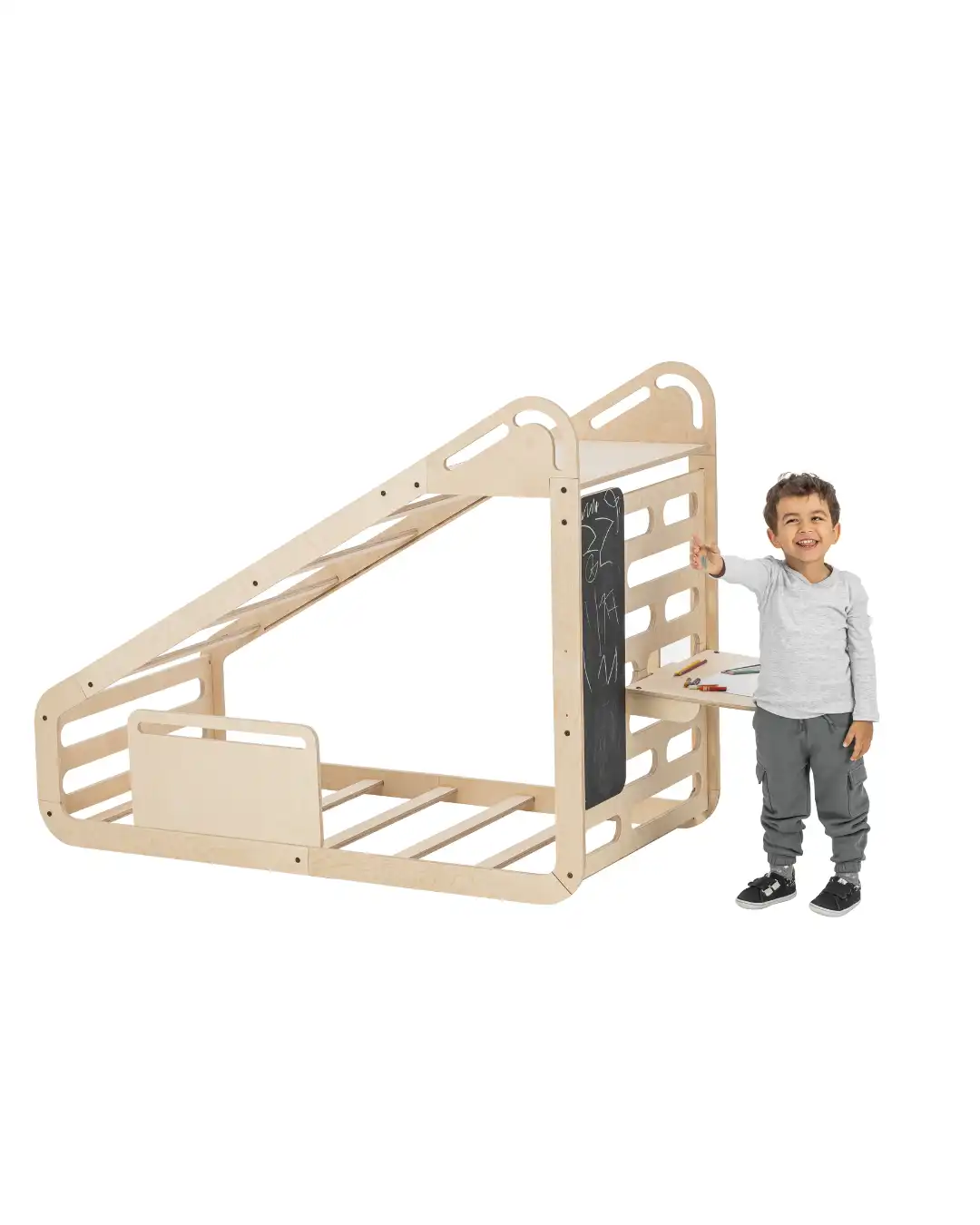Sto, crna tabla i ljuljaška će transformisati Sleepy Mini u svestrani Montesori krevet u kome vaša deca mogu udobno da spavaju i da se zabavljaju i istražuju.