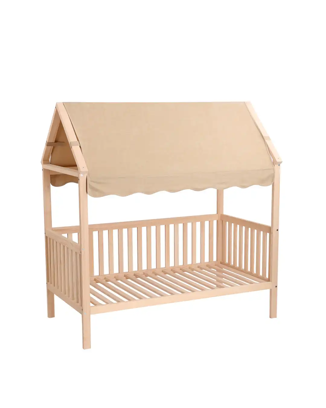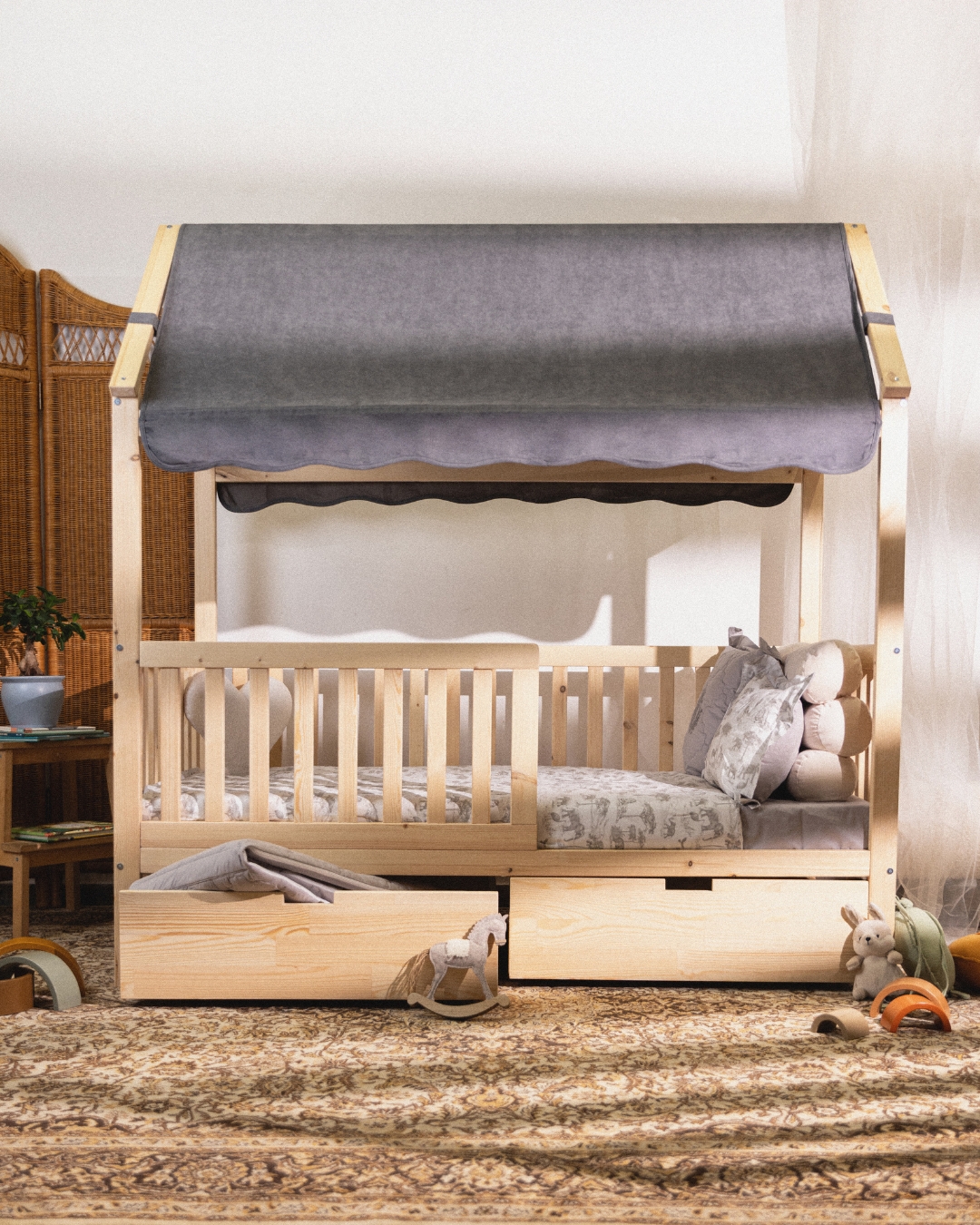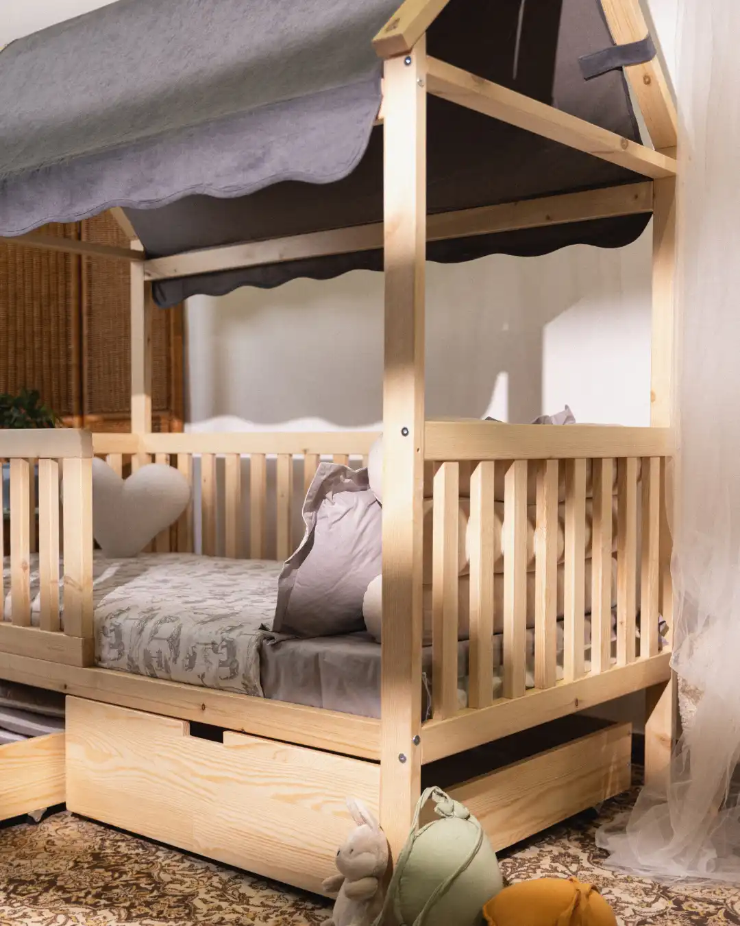 Krevet inspirisan Montessori pristupom, niske konstrukcije i krova u obliku kućice, stvara siguran i topao kutak za odmor i igru. Podstiče samostalnost deteta i unosi dozu mašte u svaku sobu- mesto gde dete slobodno istražuje, sanja i raste.