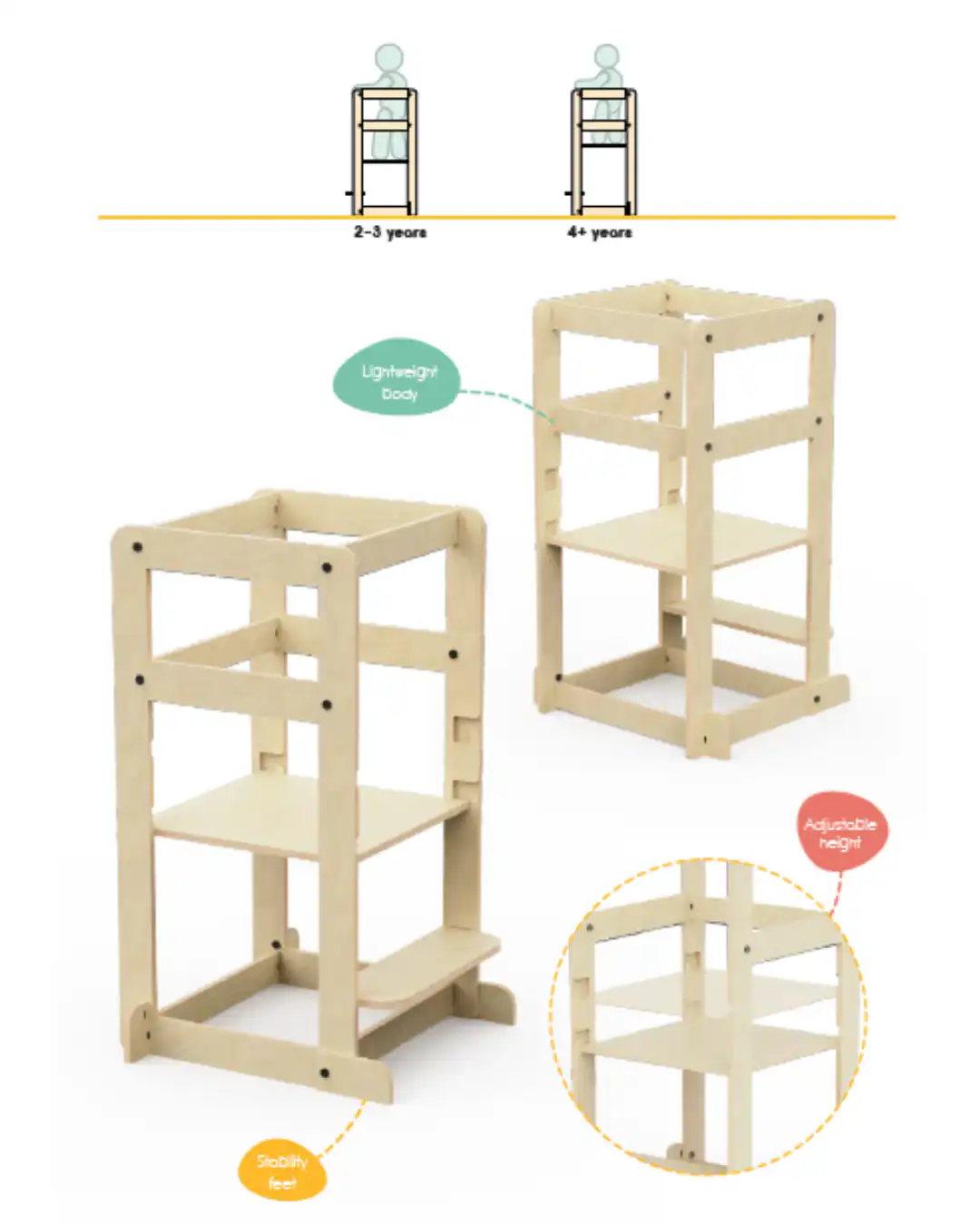 - Motoričke veštine: Penjanje na toranj i njegovo korišćenje za rukovanje kuhinjskim priborom ili drugim predmetima pomaže deci da poboljšaju koordinaciju i ravnotežu