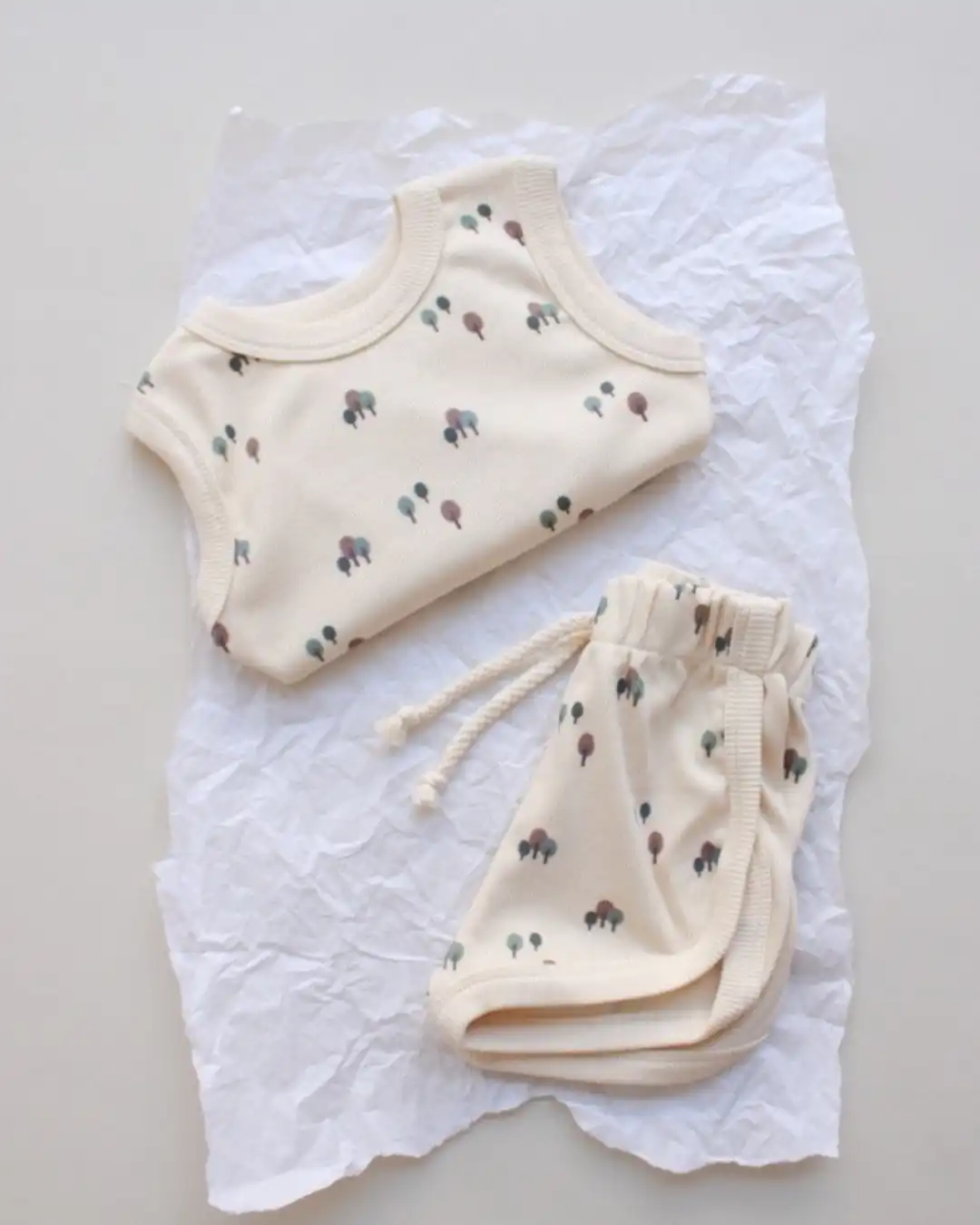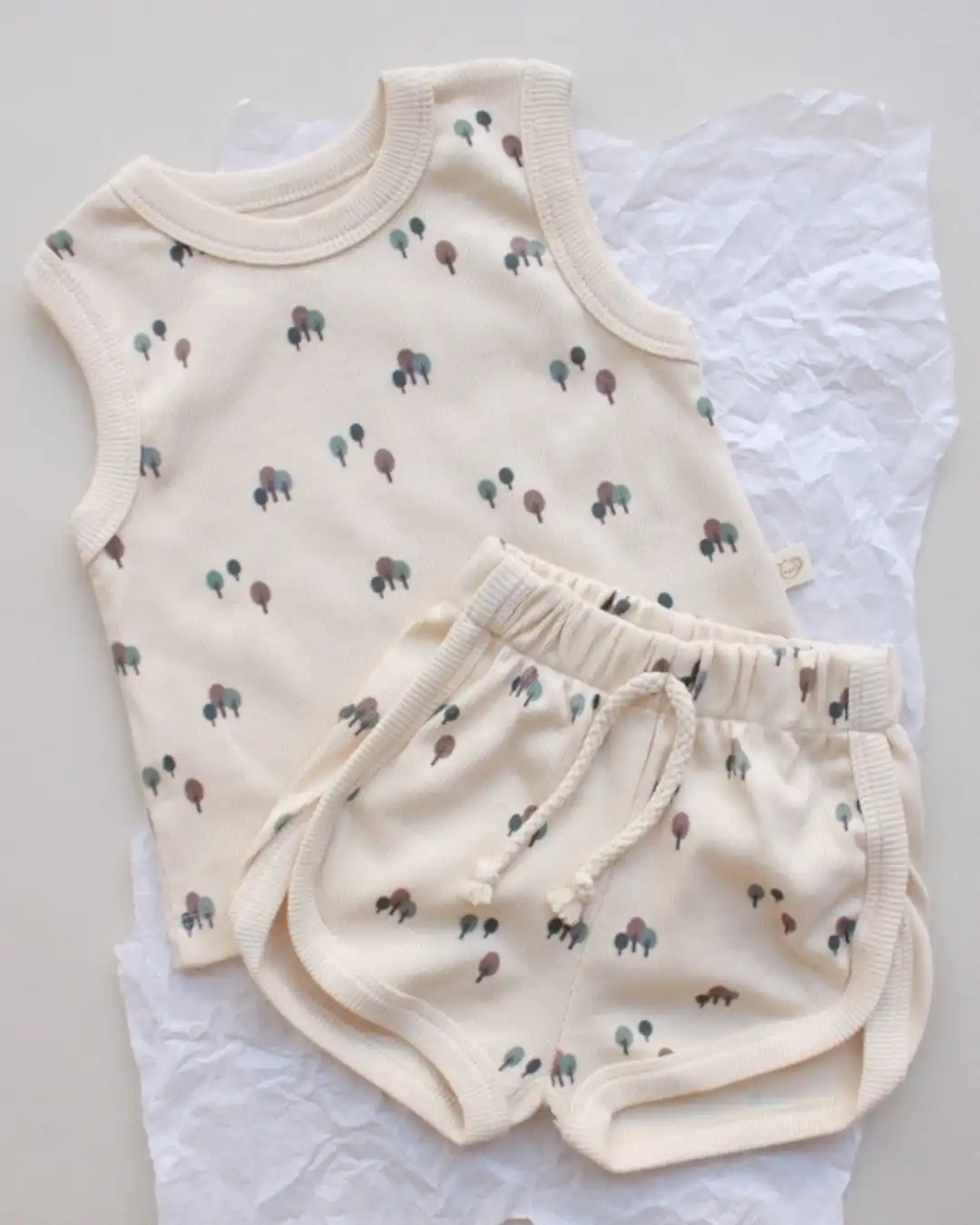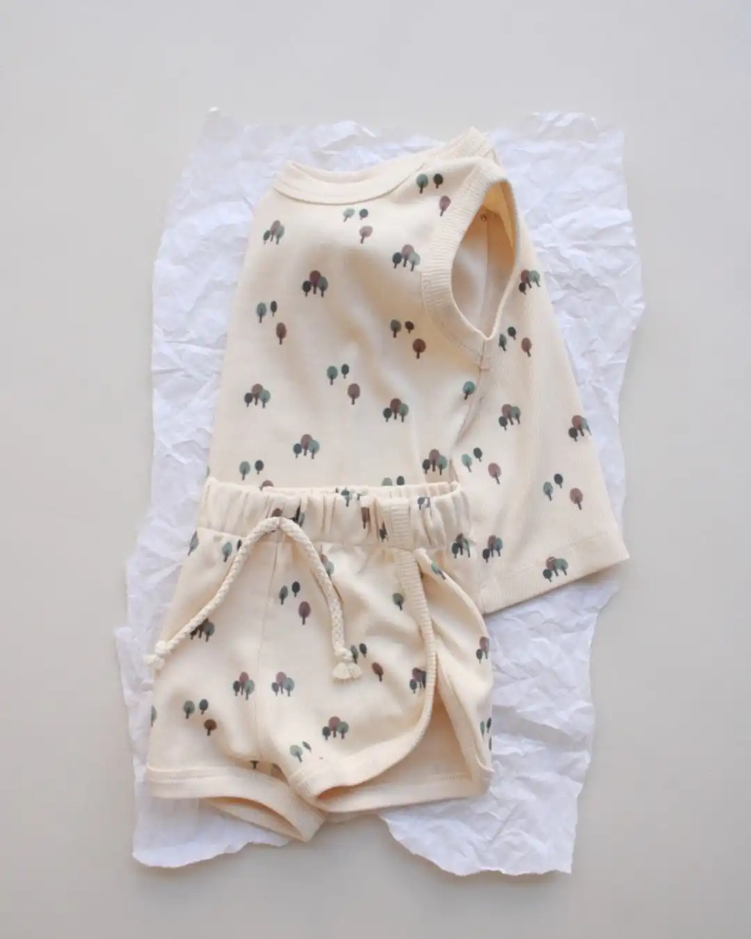 Komplet šorc i majica sa neodoljivim motivom drveća će pružiti najmlađima posebnu dozu slatkoće i savršen je spoj udobnosti i stila. 🌿