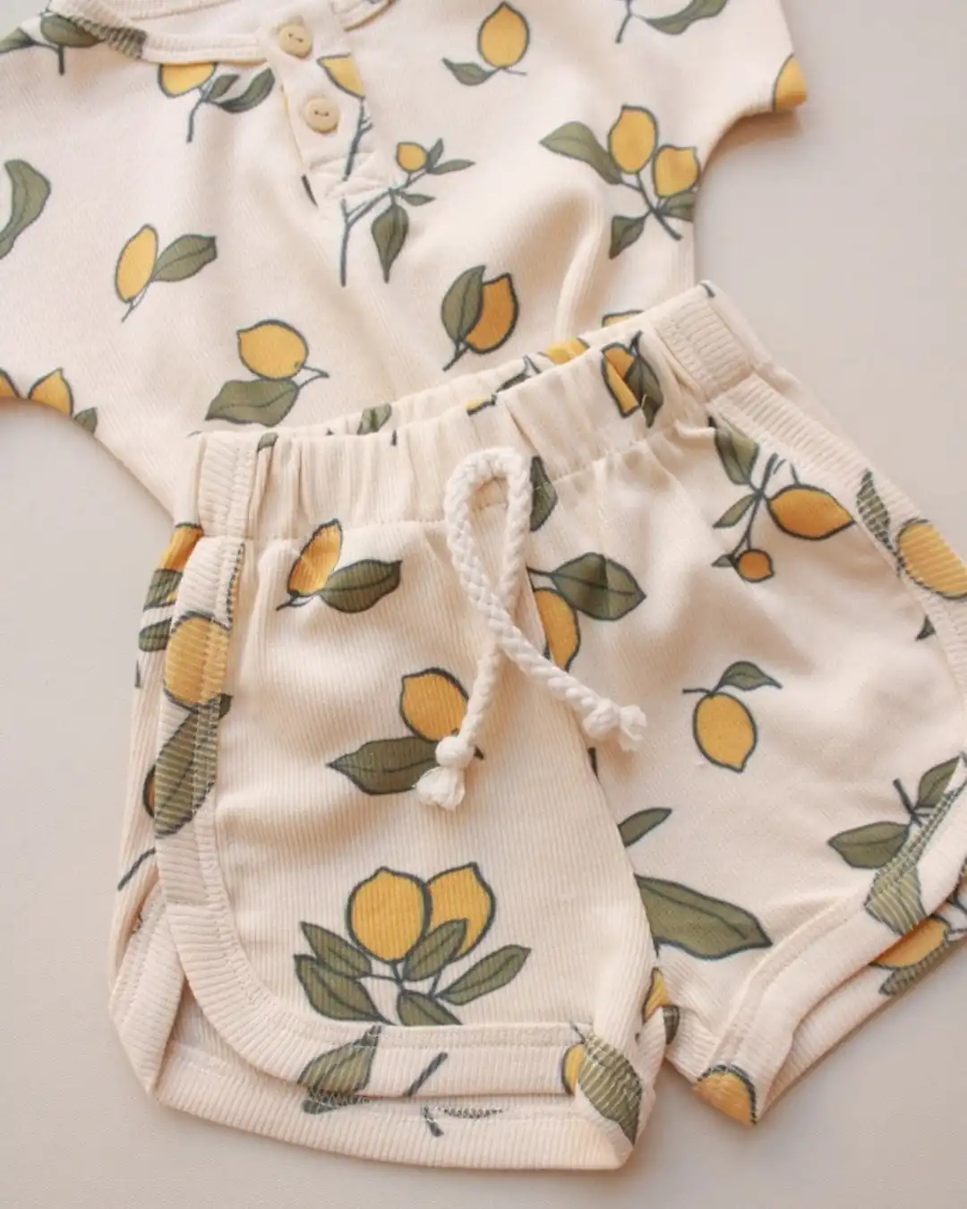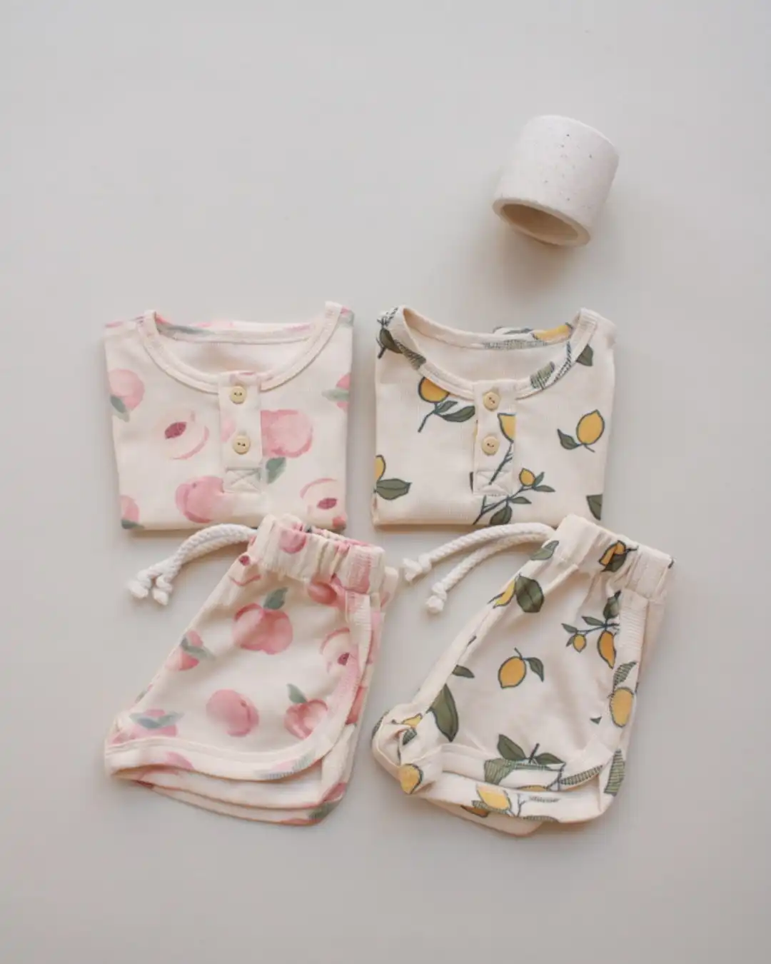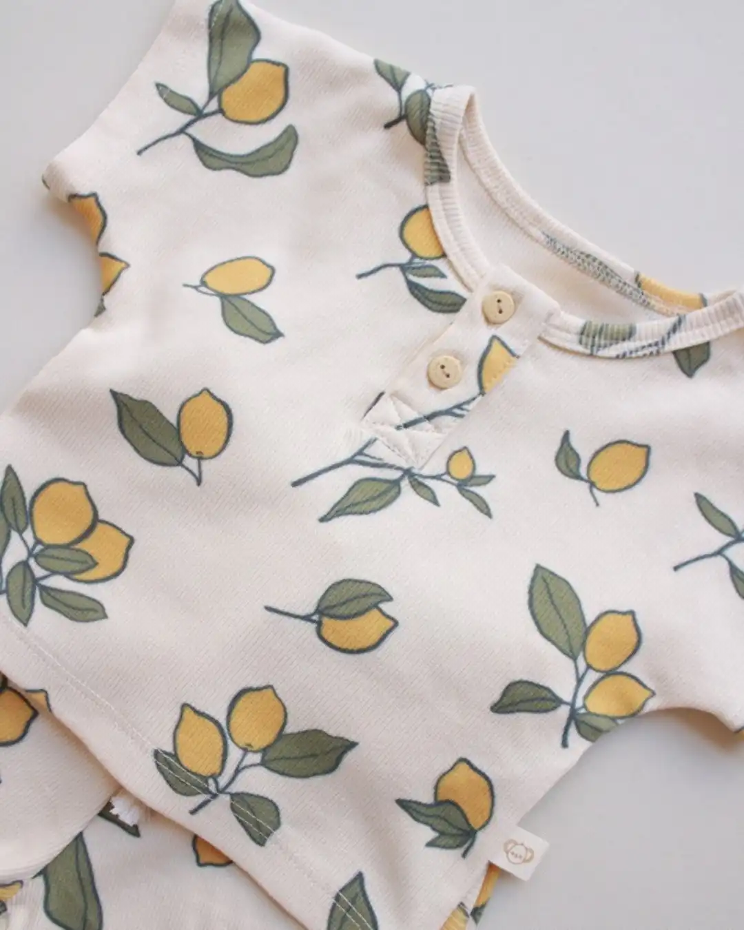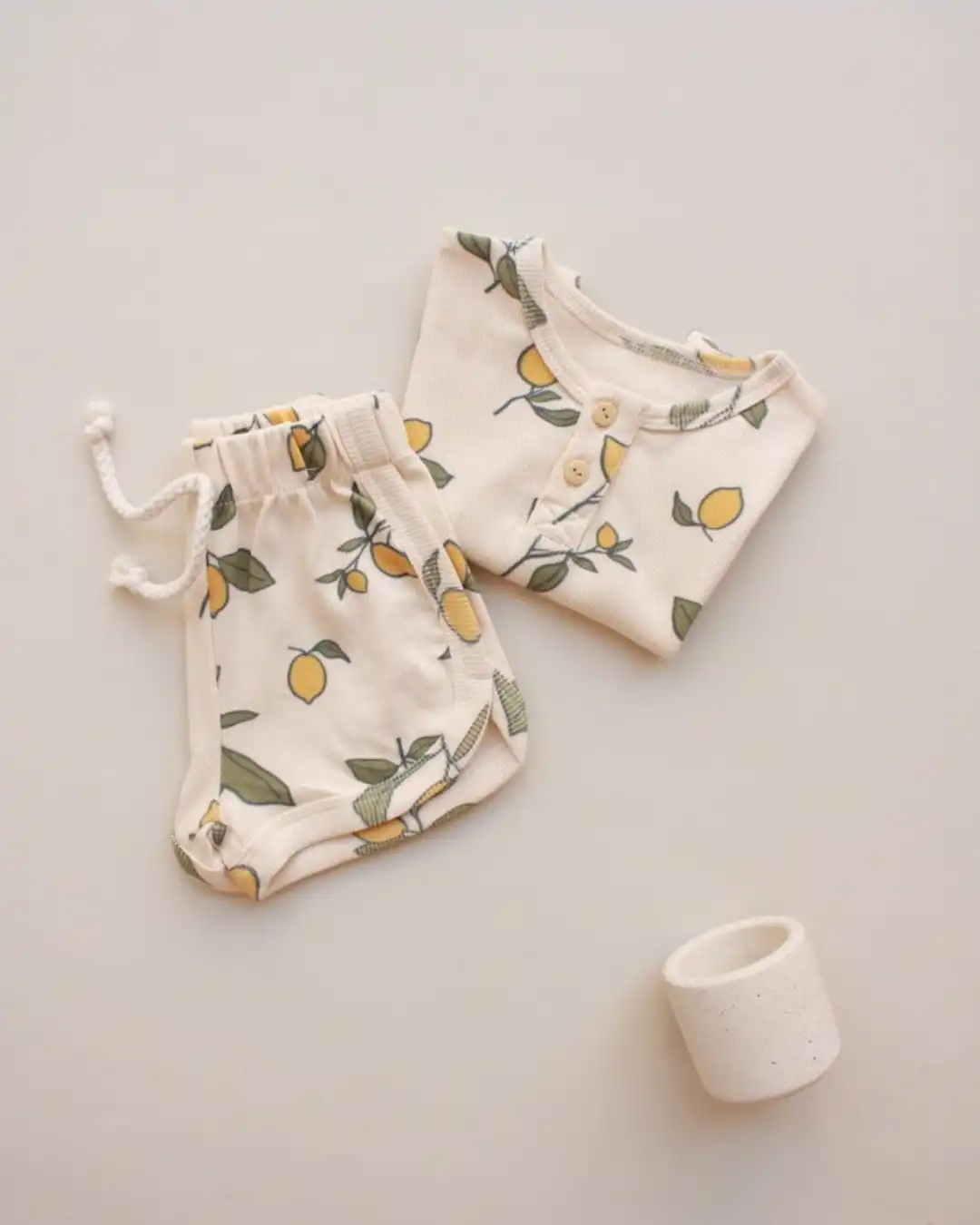 Komplet šorc i majica sa neodoljivim motivom limunčića će pružiti najmlađima posebnu dozu slatkoće i savršen je spoj udobnosti i stila. 🌿
