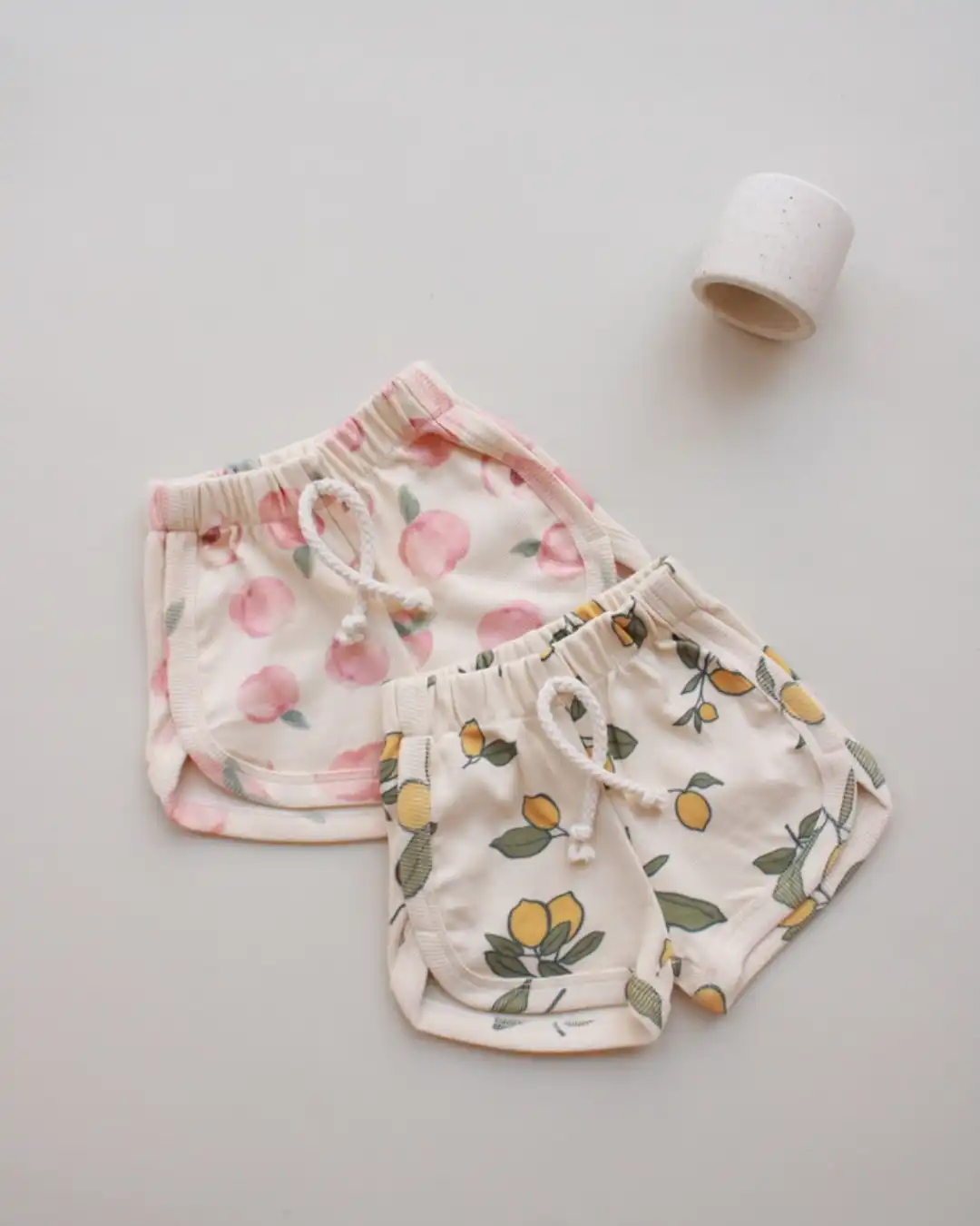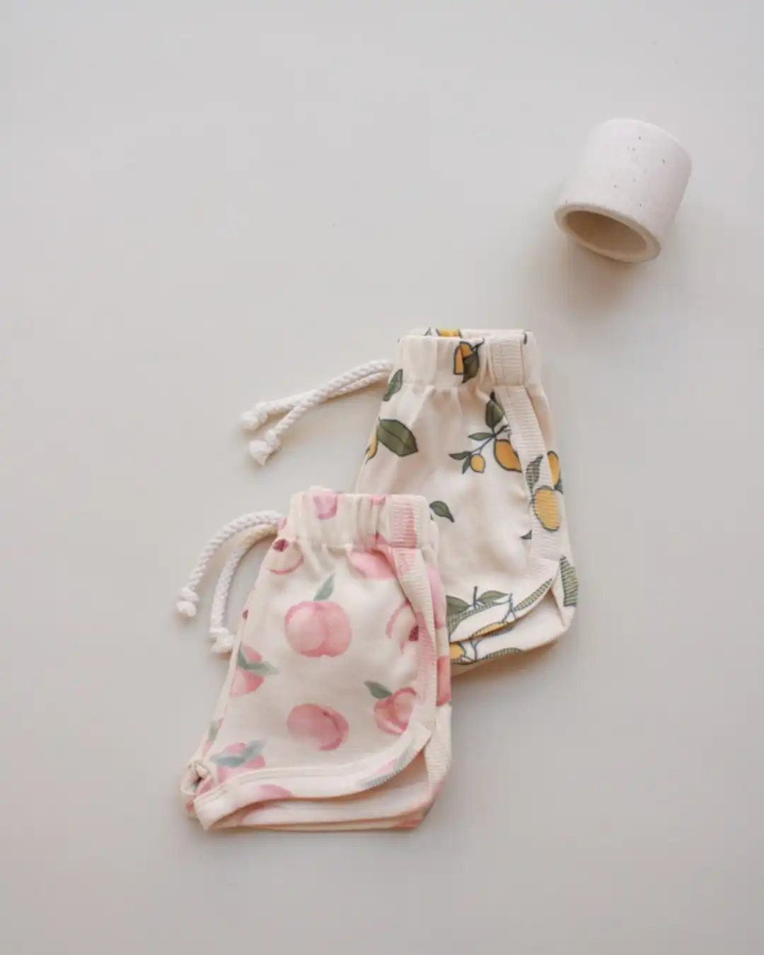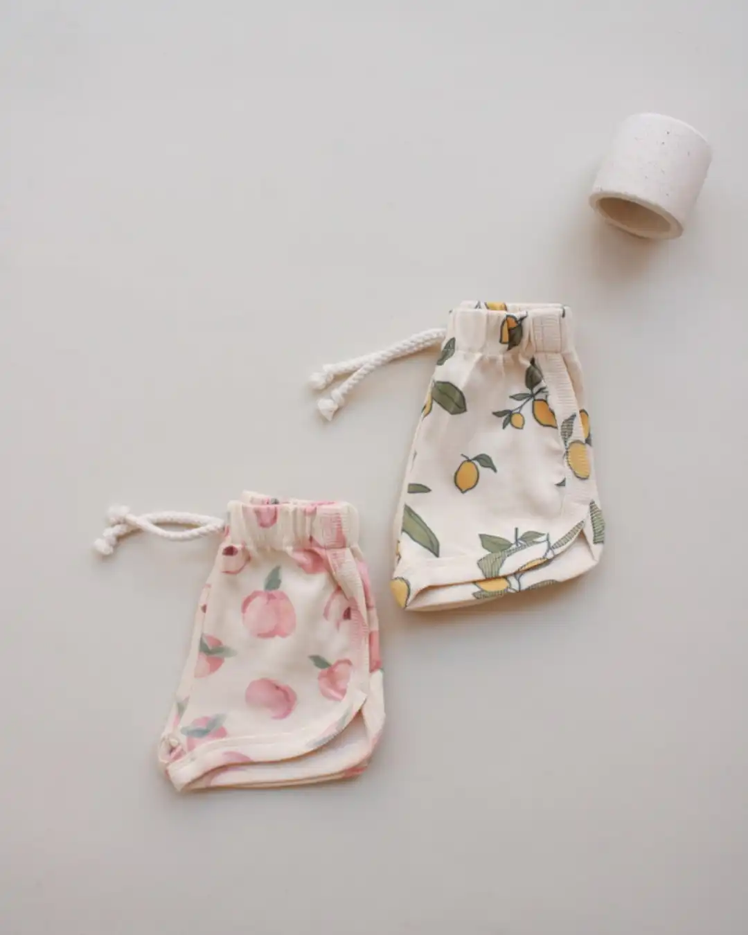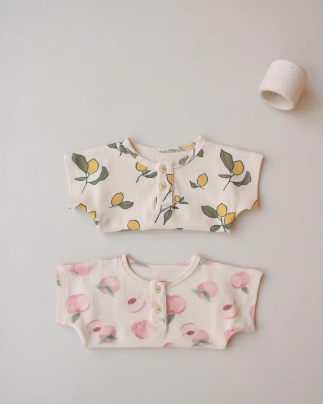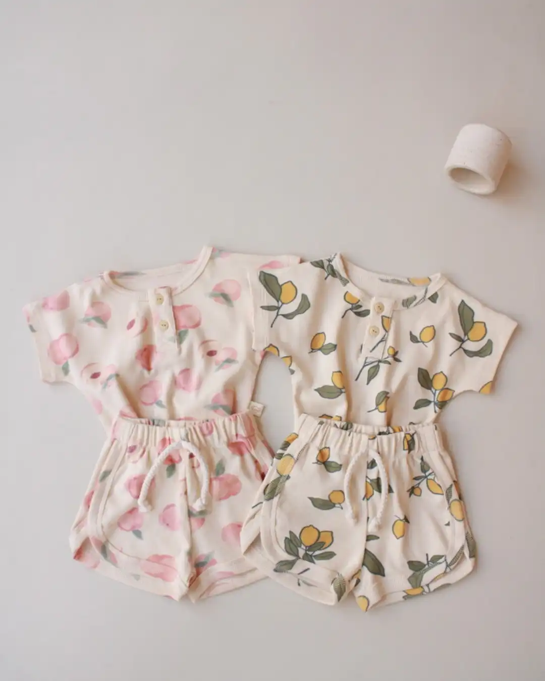Komplet šorc i majica sa neodoljivim motivom limunčića će pružiti najmlađima posebnu dozu slatkoće i savršen je spoj udobnosti i stila. 🌿