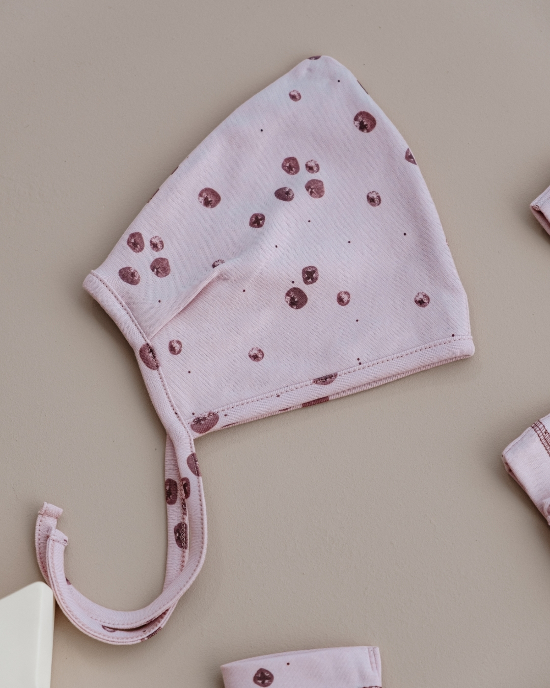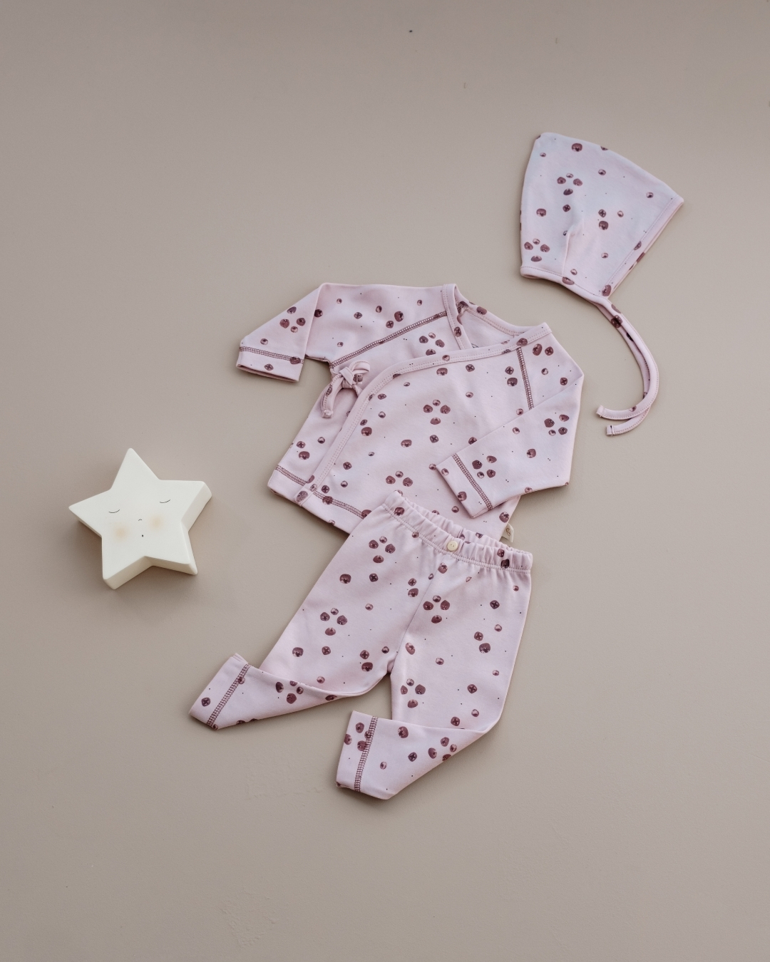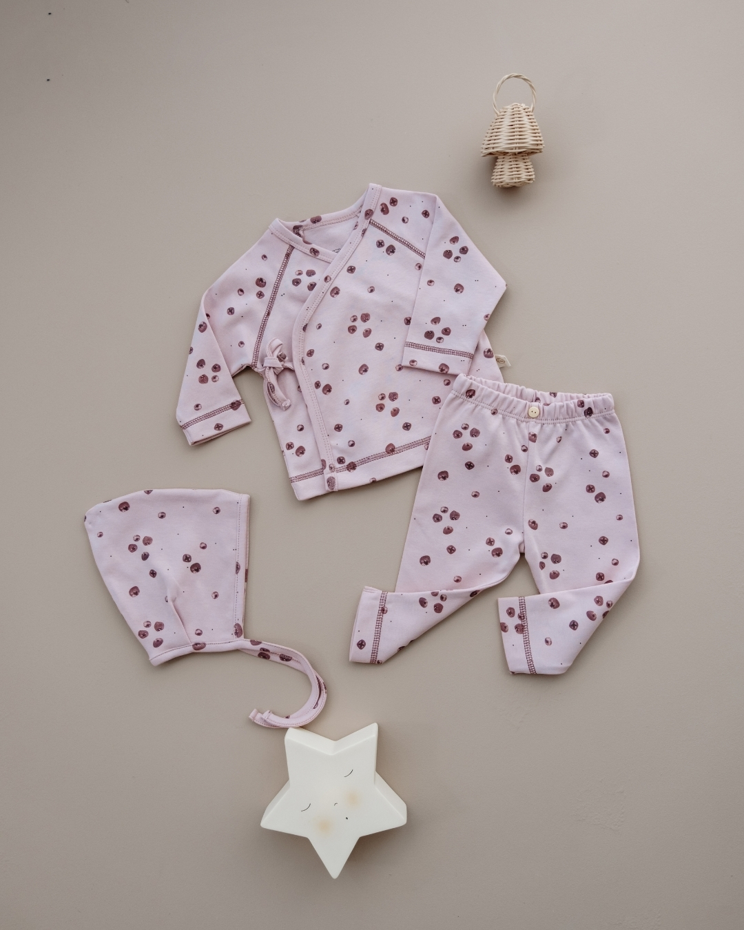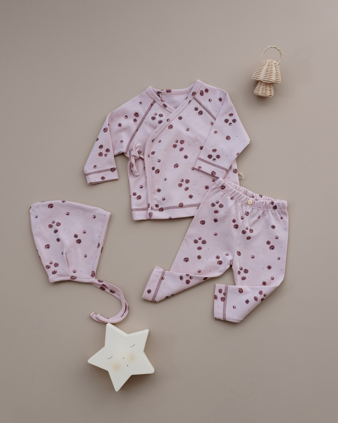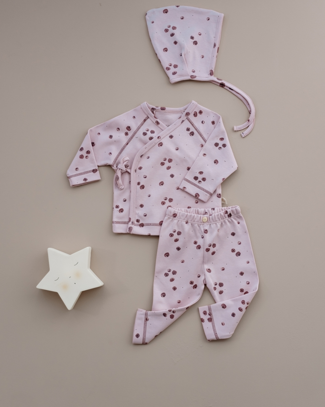 Ovaj nežni komplet sastoji se od tri udobna dela: mekanog gornjeg dela na preklop, rastegljivih pantalonica i simpatične kapice na vezivanje. Napravljen je od prijatnog, mekanog pamuka koji nežno dodiruje bebinu kožu i omogućava joj potpunu slobodu pokreta.