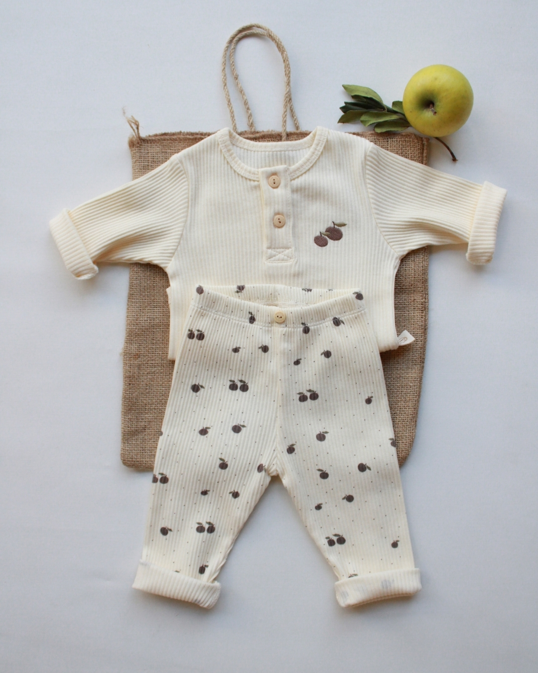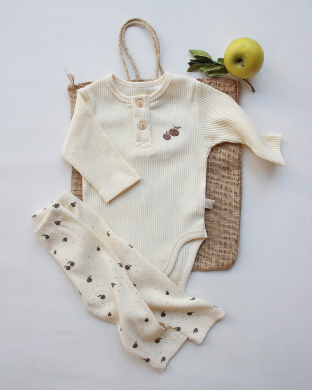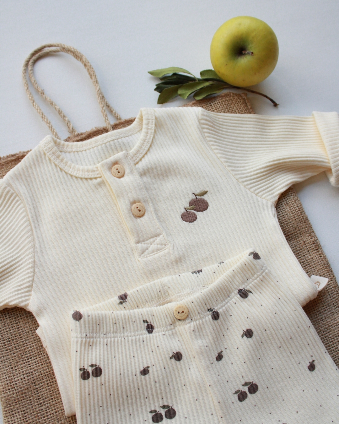 Ovaj nežni bebi komplet sa motivom jabuke je primer savršenog spoja udobnosti, funkcionalnosti i predivnog, čistog dizajna. Na prvi pogled deluje jednostavno, ali upravo ta jednostavnost je njegova najveća snaga — izgleda luksuzno, prirodno i savršeno za svaki trenutak tokom dana.