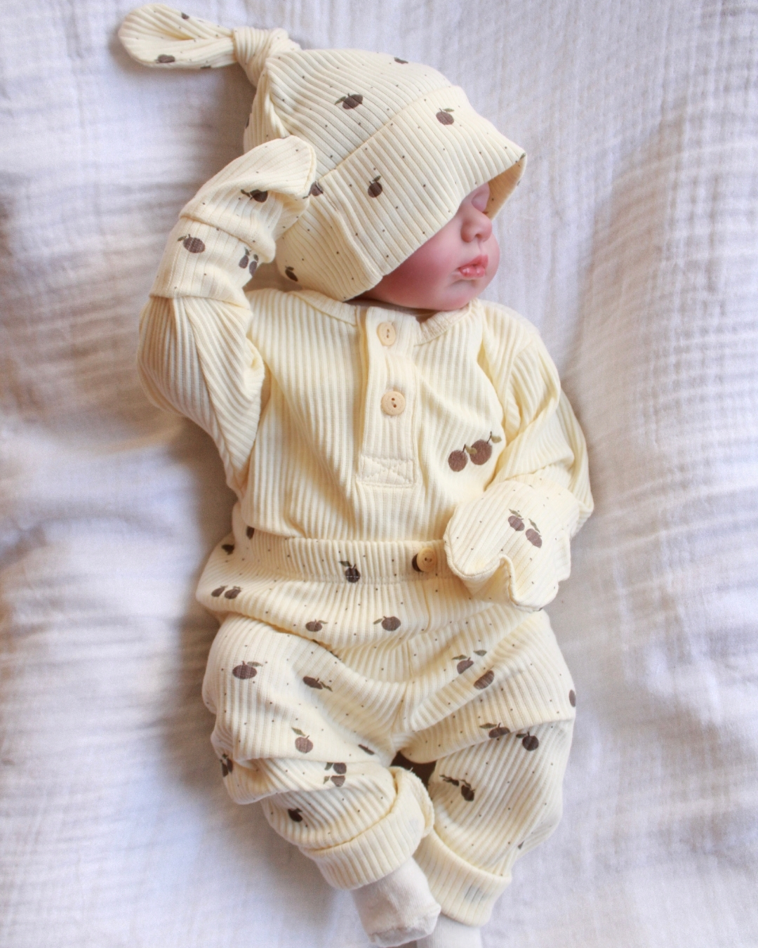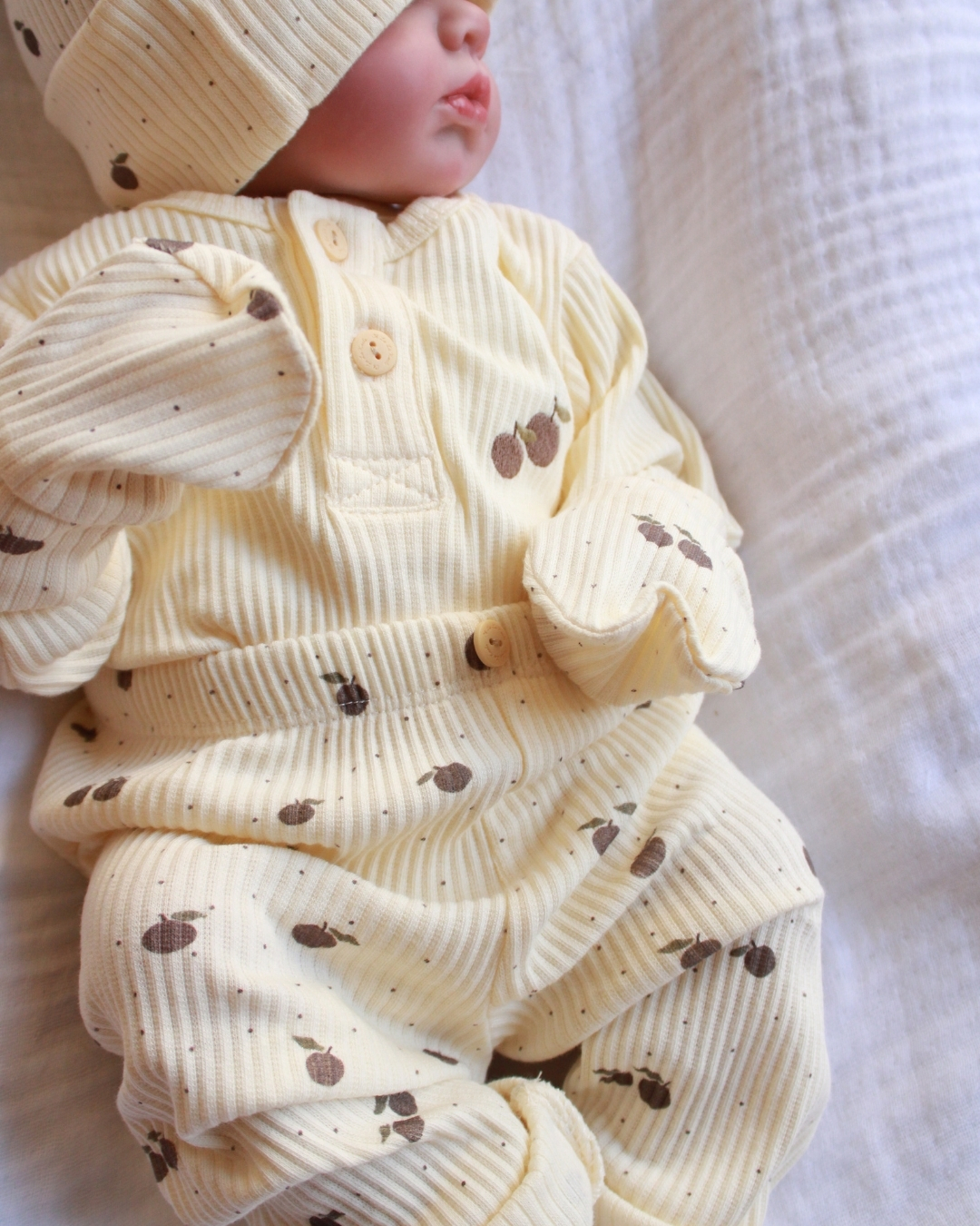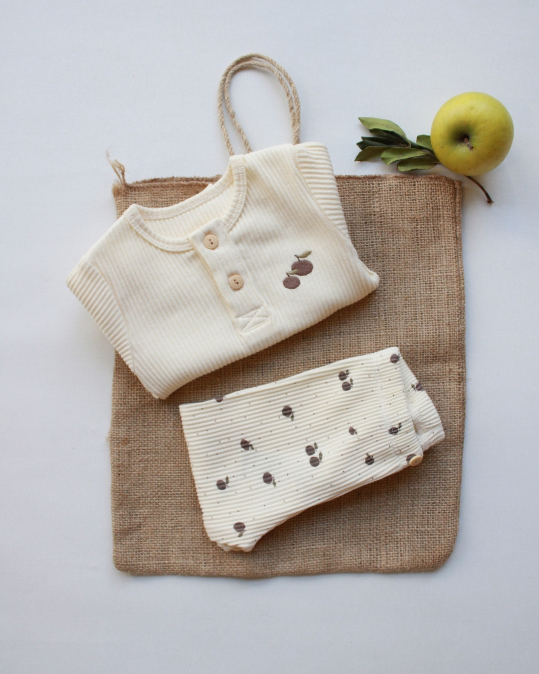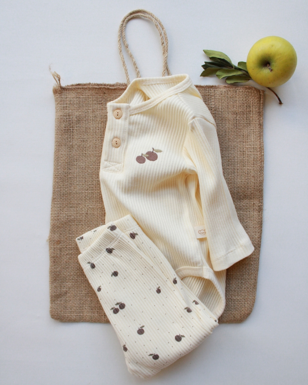 Ovaj nežni bebi komplet sa motivom jabuke je primer savršenog spoja udobnosti, funkcionalnosti i predivnog, čistog dizajna. Na prvi pogled deluje jednostavno, ali upravo ta jednostavnost je njegova najveća snaga — izgleda luksuzno, prirodno i savršeno za svaki trenutak tokom dana.