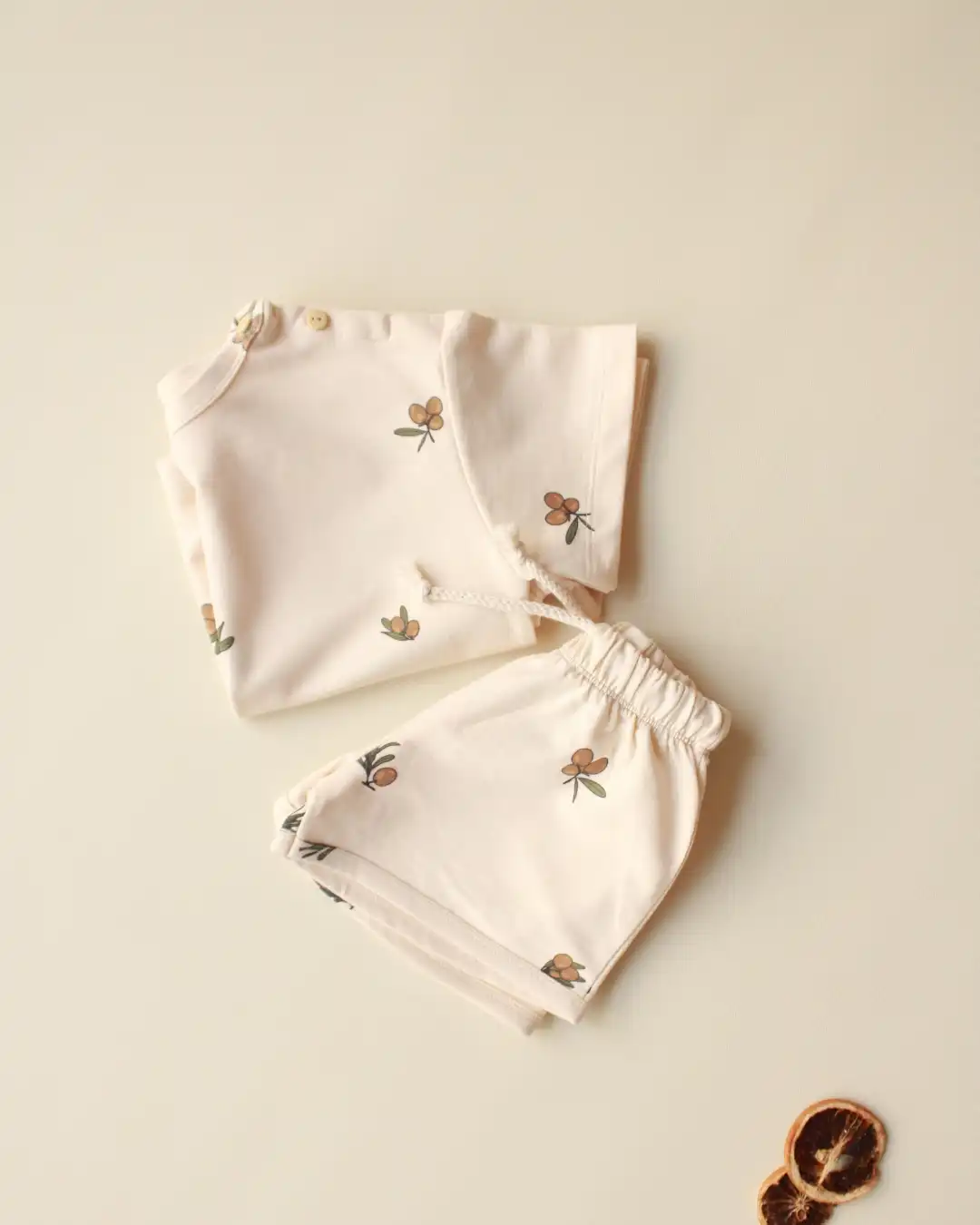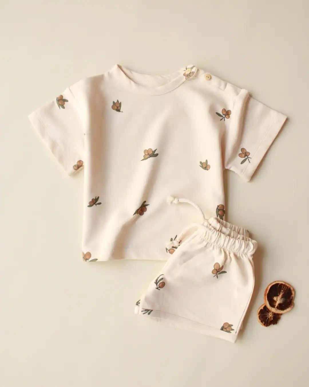 Komplet šorc i majica sa neodoljivim motivom maslina će pružiti najmlađima posebnu dozu slatkoće i savršen je spoj udobnosti i stila. 🌿