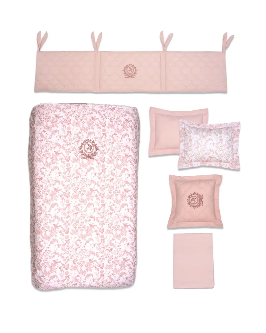 Set sadrži sve što vam je potrebno za opremanje krevetića: jorgan, navlaku za jorgan, čaršaf, jastuk sa jastučnicom, ukrasni jastuk sa jastučnicom, te ogradicu za gornju i bočnu stranu.